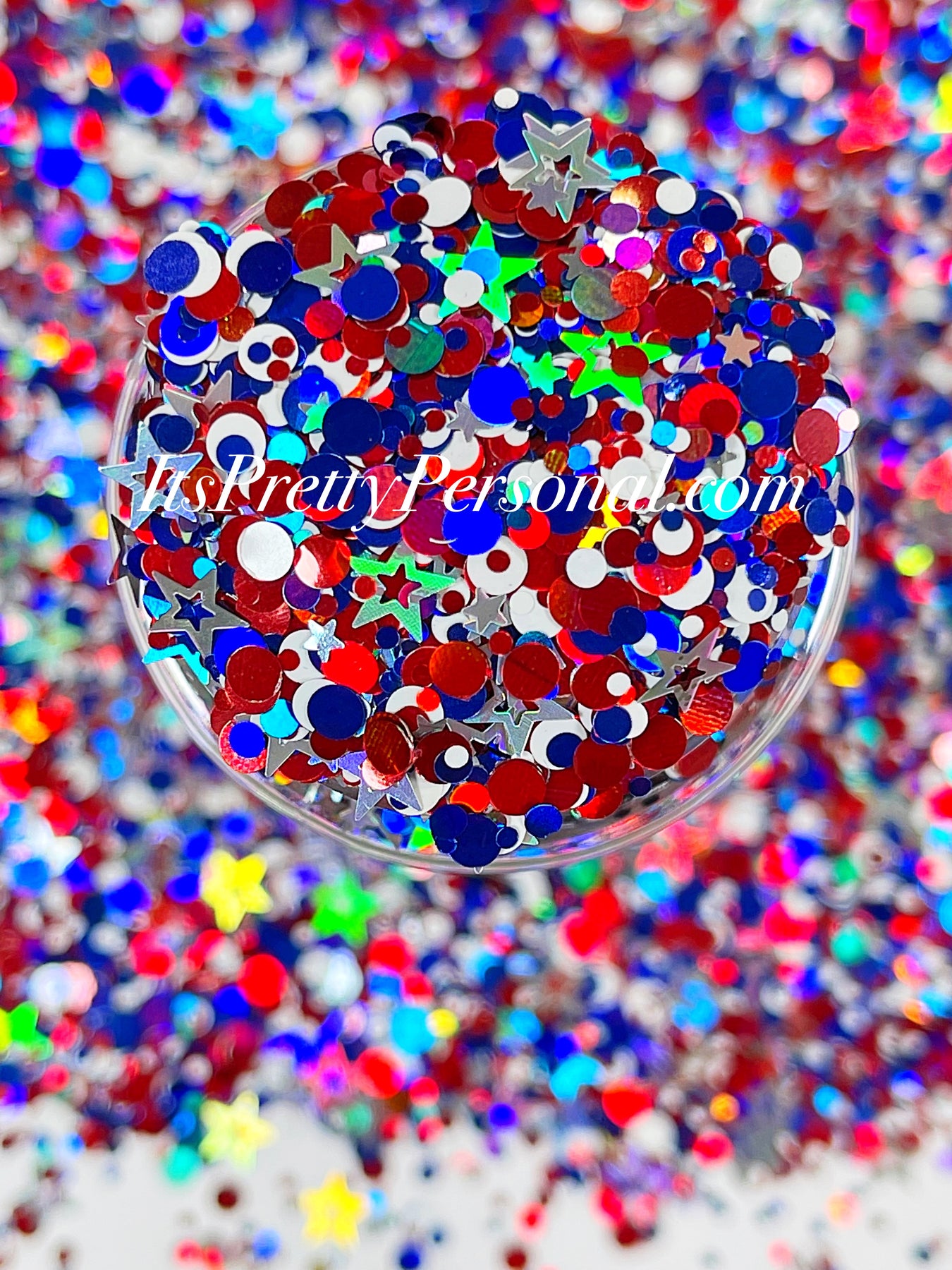Red, white, blue and silver patriotic mix. Dots and stars.