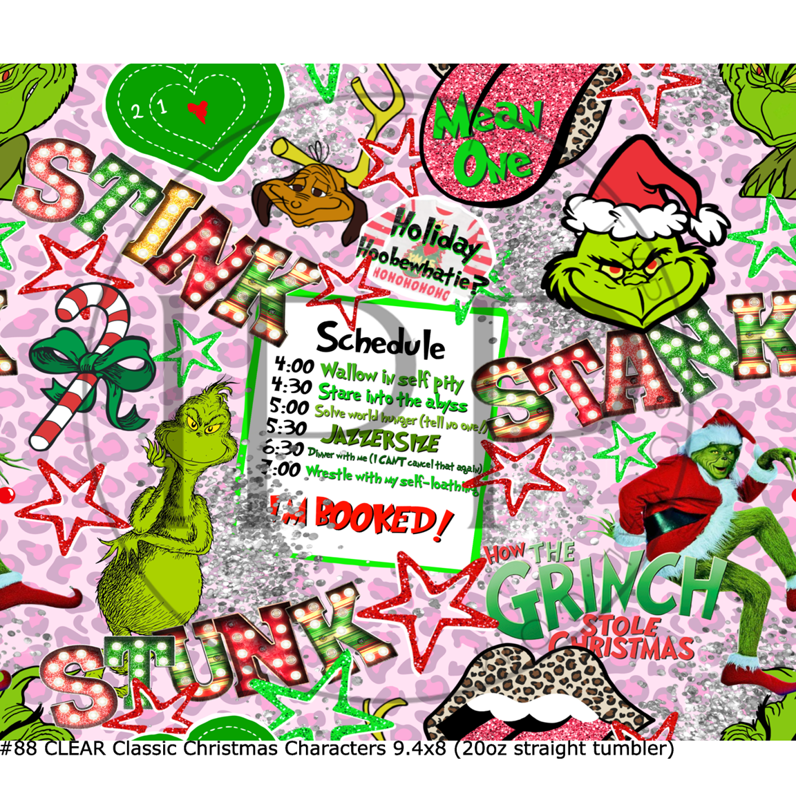 #88 CLEAR Mean Green Classic Christmas- 20oz Skinny Straight- 9.4" x 8" Pattern Vinyl Wrap