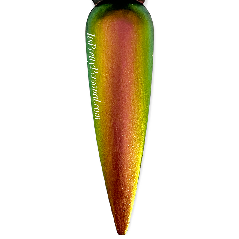 Extreme color shifting chameleon look on a black base. Sample shown on a Black base.