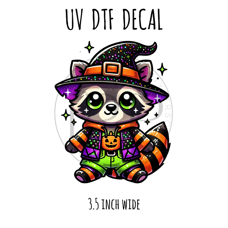 #618 Spooky Cute Witchy Racoon- 3.5 inch wide UV DTF decal