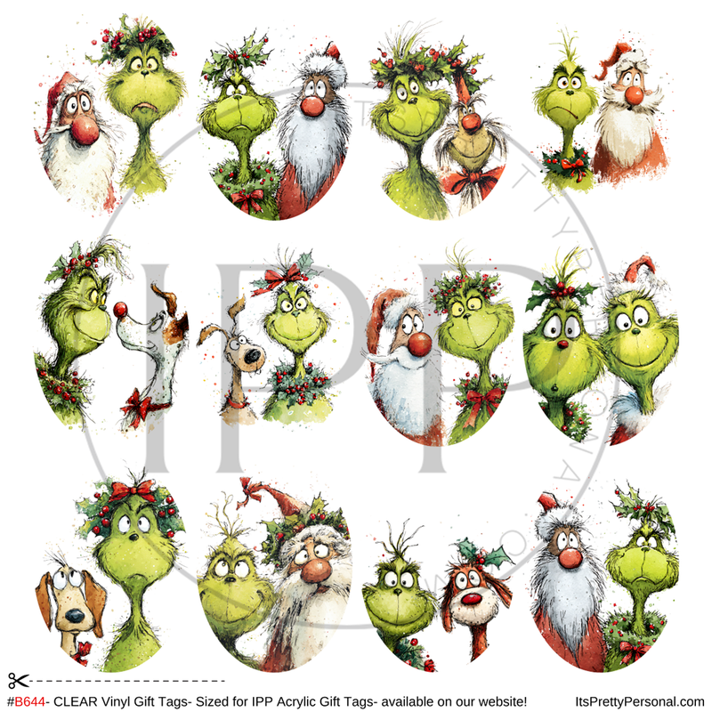 #B644-CLEAR Vinyl Gift Tag Helper Sheet-Mean Green and Santa-12x12 CLEAR Pattern Vinyl