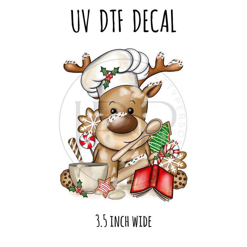 #634 Cute Cookie Baking Reindeer- 3.5 inch wide UV DTF decal