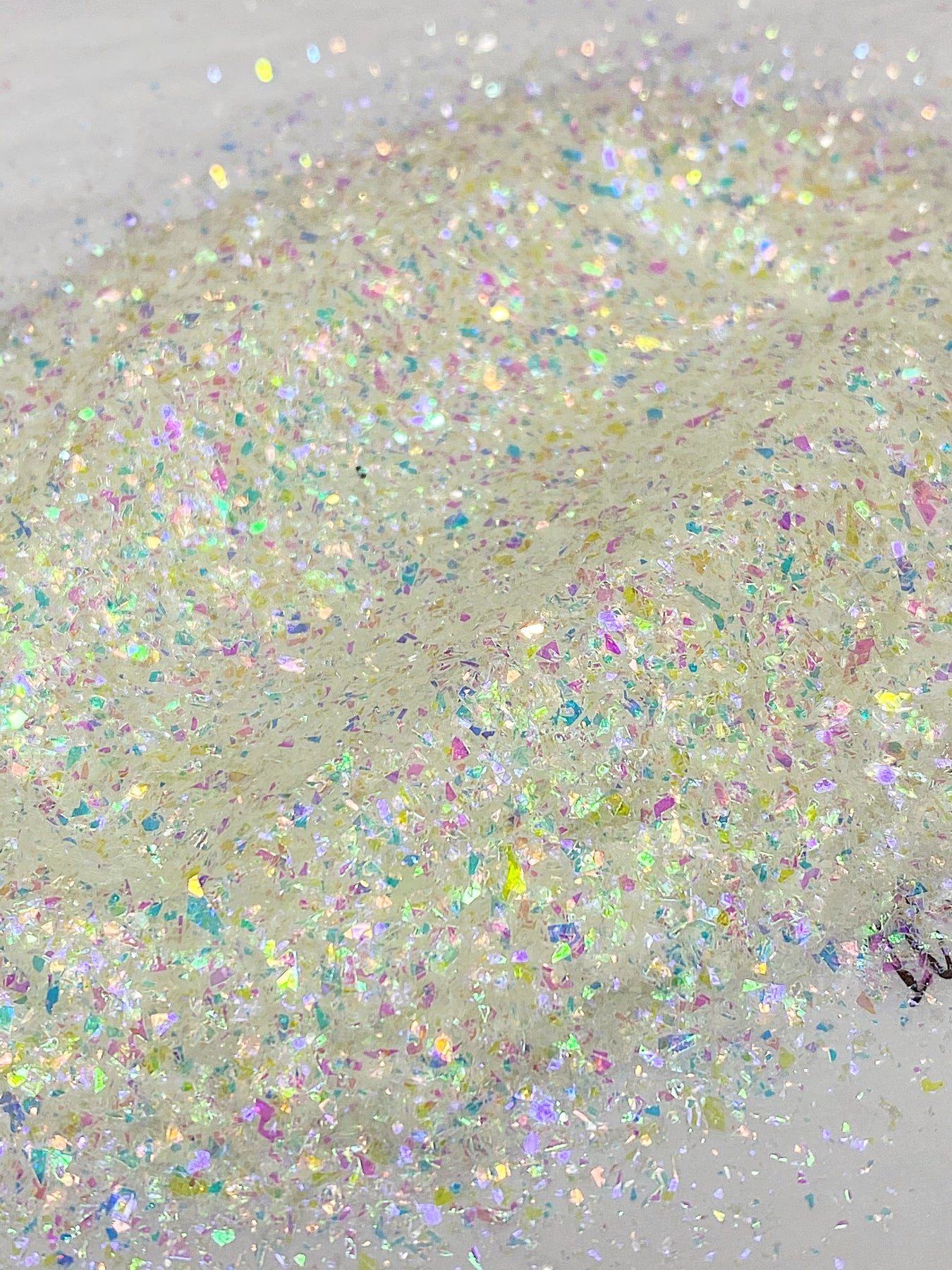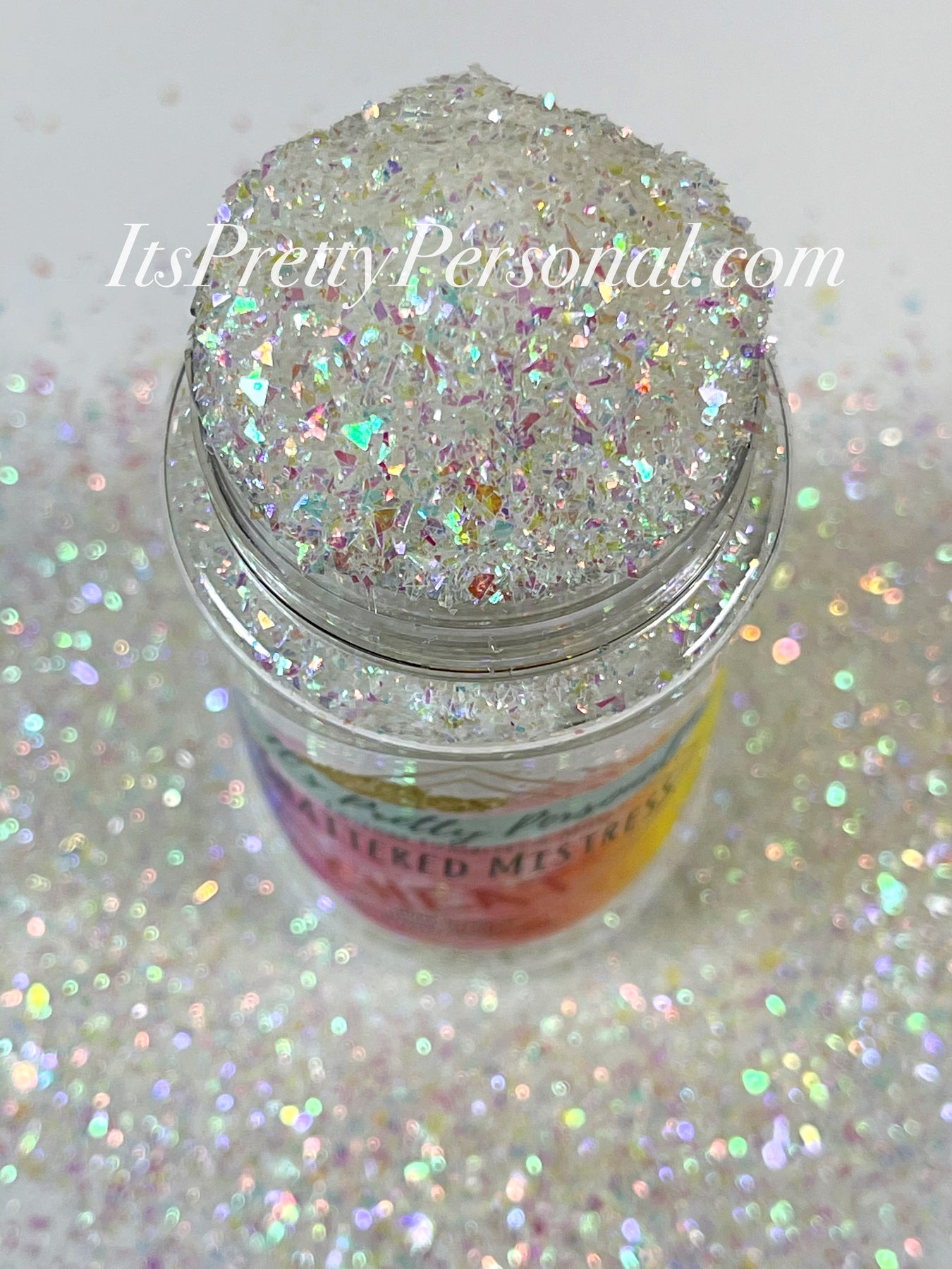 "Mistress”- A TRUE Opal White color Glitter. Rainbow shine will allow this cheat glitter to work on almost any color base. This is currently our TOP CHOICE for darker color bases.